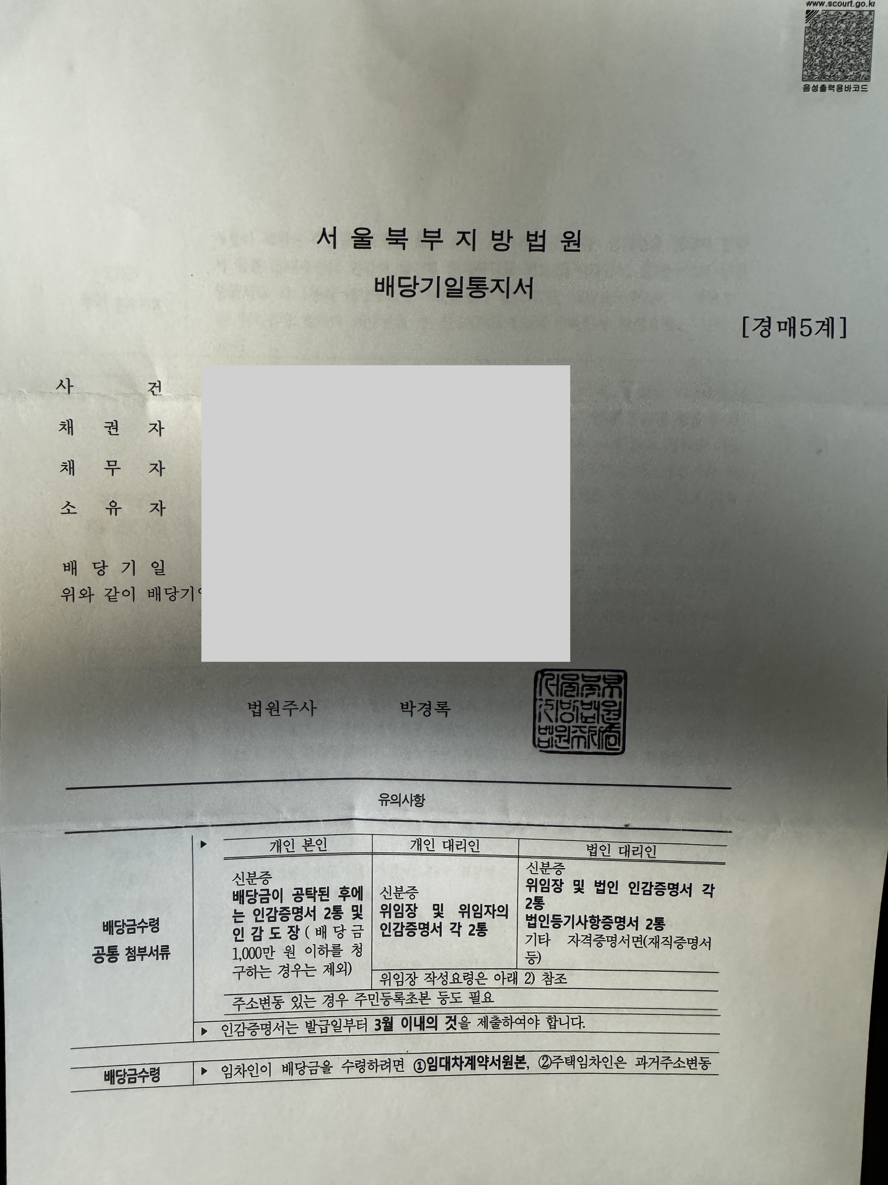 경매 물건이 낙찰되고 매각 허가 결정이 나면 배당요구를 신청한 사람이나 법인, 기관에게 배당기일 통지서를 발송합니다. 통지서를 받고 배당기일까지의 이자를 계산해서 채권 계산서를 법원에 제출해야 합니다.