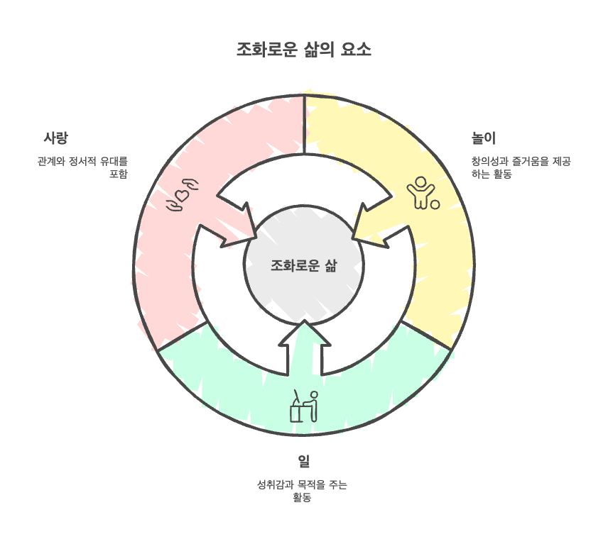 이 책에서 저자는 삶의 위대한 세 영역을 사랑, , 놀이라고 정의합니다. 이 세 가지로 삶을 채우고, 그 과정에서 삶의 의미를 찾아야 한다는 것이 책의 핵심 메시지입니다.